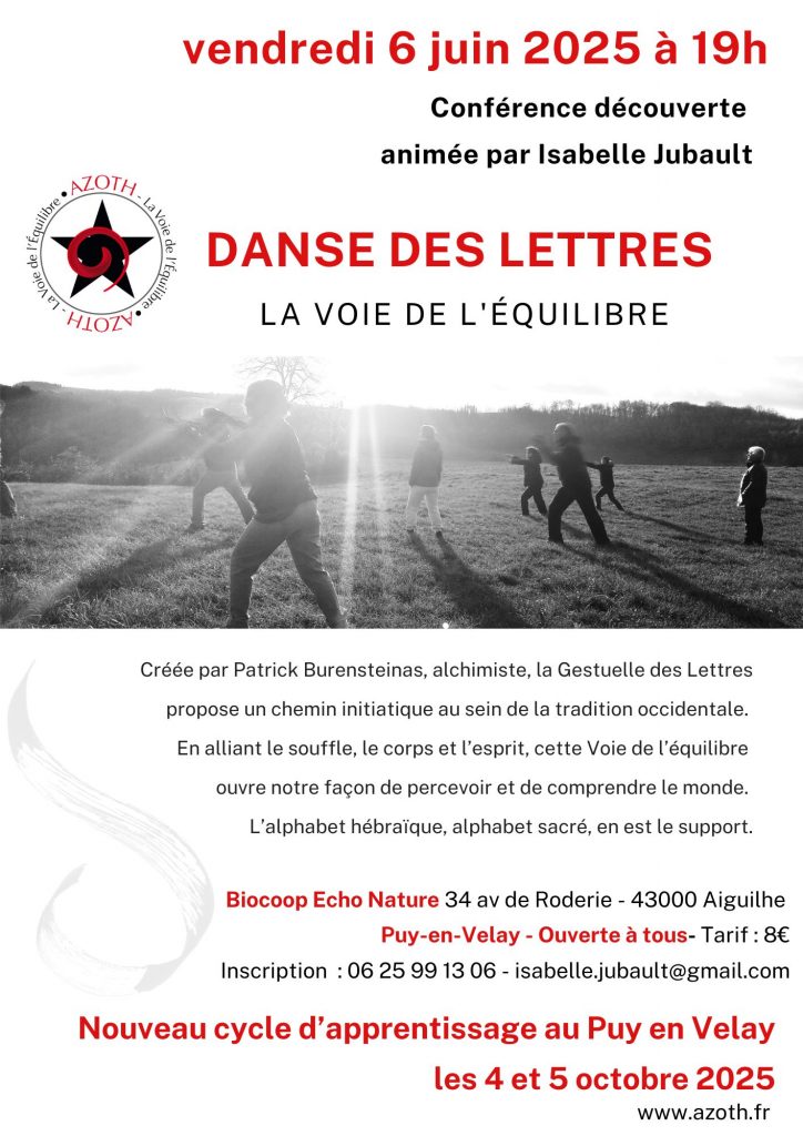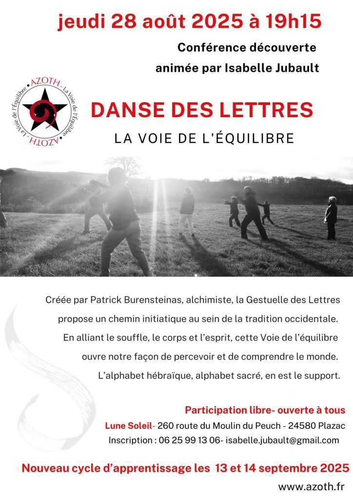 La Voie de la Gestuelle des Lettres (aussi appelée Danse des Lettres) a été créée par Patrick Burensteinas, alchimiste, pour permettre à celles et ceux qui le souhaitent de cheminer sur la Voie de l’équilibre, chemin initiatique et laïque au sein de la tradition occidentale.